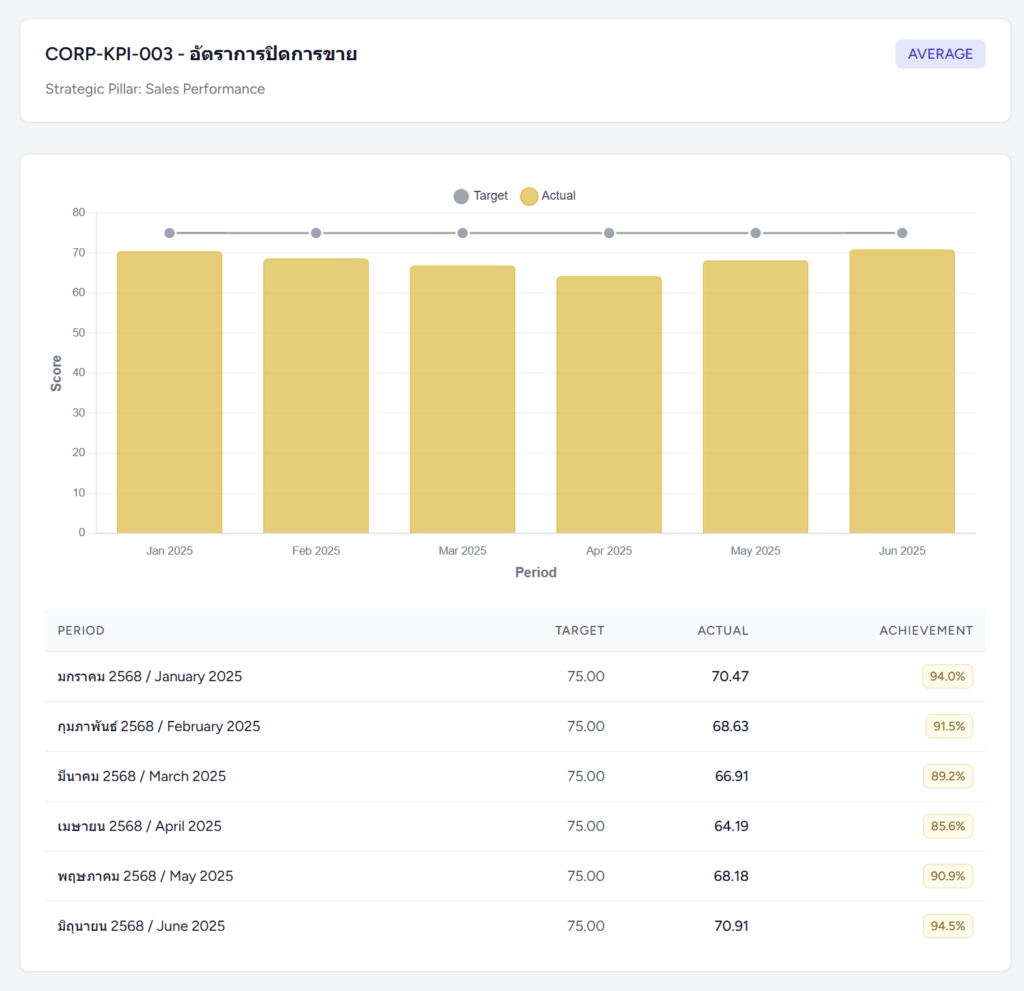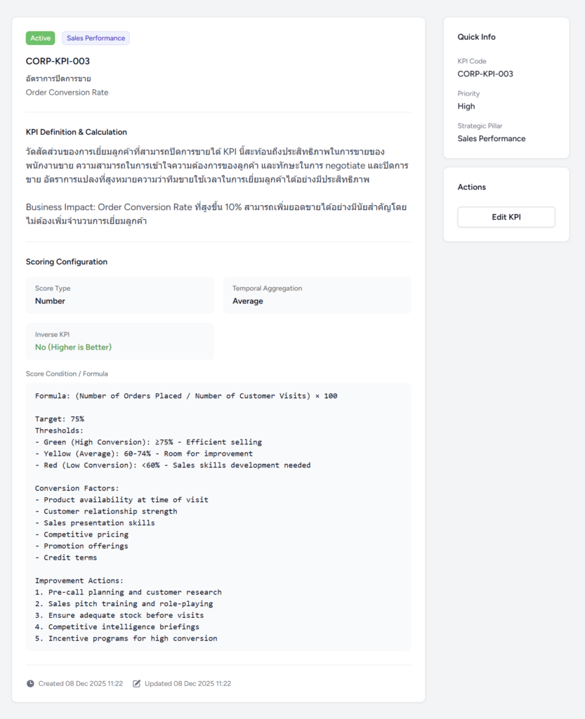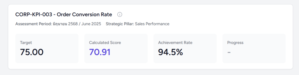 ในระบบ KPI ของ EsteeMATE Conversion Rate ถูกออกแบบให้มีเกณฑ์ประเมินที่ชัดเจน เช่น 80% ขึ้นไปจัดว่า “ดีมาก” ในหลายอุตสาหกรรม โดยในตัวอย่างที่เห็น อัตราการปิดการขายอยู่ที่ประมาณ 94.5% ซึ่งถือว่าสูงกว่ามาตรฐานทั่วไปมาก และบอกได้ทันทีว่าทีมขายในพื้นที่นั้นเข้าใจตลาด มีความสัมพันธ์ที่ดี และสามารถสร้างมูลค่าทางธุรกิจได้อย่างต่อเนื่อง